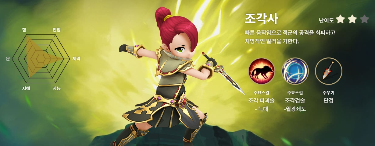 조각사는 근거리 직업이면서 전사보다 방어력이 낮기 때문에 초반에 어렵습니다. 하지만 충분히 육성한다면 후반에 높은 치명타 확률을 가지고 뛰어난 전투력을 낼 수 있습니다.